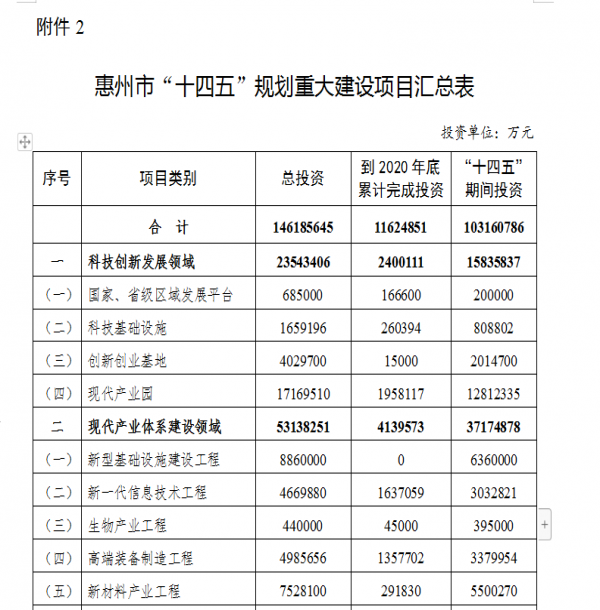 6月3日,惠州市政府正式對外公布《惠州市國民經(jīng)濟和社會發(fā)展第十四個五年規(guī)劃和2035年遠景目標綱要》(下稱《綱要》)。其中明確提出,“十四五”期間規(guī)劃建設(shè)重大項目312宗,計劃總投資近1.5萬億元,“十四五”期間計劃投資10316億元。