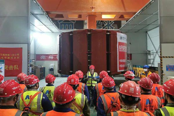吊裝過程中,現(xiàn)場進(jìn)行技術(shù)交底,相關(guān)人員各司其職、各盡其責(zé),兩臺載重250噸的橋機(jī)通過平衡梁專用工具,吊起轉(zhuǎn)子,緩緩平移出工位棚,向著機(jī)坑方向移動,上機(jī)架、下機(jī)架處作業(yè)人員嚴(yán)格監(jiān)視著轉(zhuǎn)子進(jìn)入定子的位置,配合調(diào)整方向、核對同心度,確保轉(zhuǎn)子準(zhǔn)確吊入定子中心,經(jīng)過近兩個小時的連續(xù)奮戰(zhàn),2號機(jī)組轉(zhuǎn)子順利與發(fā)電機(jī)大軸緊密連接,順利吊裝成功。