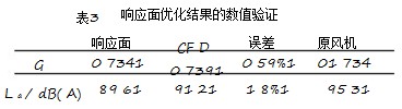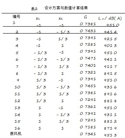 對于根據(jù)樣本點擬合出來的響應面多項式, 常使 用 統(tǒng) 計 學 中 的 決 定 系 數(shù) R ( coef ficient ofm ult iple det er minat ion)2a和修正決定系數(shù)R ( R square adjust ed) 來評價響應面的近似質(zhì)量。-這兩個系數(shù)越接近于 1, 表示響應面的近似程度越高, 足夠的逼近通常要求 R 2 和 R 2 的值在 0 9 以上。a1421樣本點設計和數(shù)值結(jié)果分析選取風機的效率 G和 A 聲級 L a 為設計目標, 應用響應面分析方法優(yōu)選 € €l 和 H 的范圍, 首先將 € €l 和H編碼至(- 1, 1) 產(chǎn)生設計空間, 見表 1。.jpg)