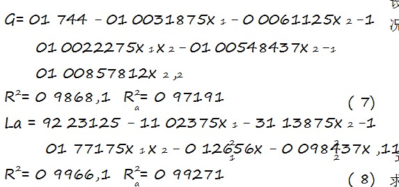 由于 R 和 R 都很接近于 1, 因此認為所得到的多項式擬合程度較好, 可以用來預測和進行優(yōu)化分析。根據(jù)上述回歸方程描繪出響應曲面及等高線圖以確認€x1) 、 x 2 ) 對 G和 La 的影響, 如圖 5、 6 所示。H(l(€圖