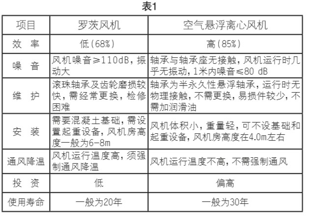 城鎮(zhèn)污水處理廠鼓風(fēng)曝氣系統(tǒng)常用的鼓風(fēng)機(jī)有羅茨風(fēng)機(jī)和離心風(fēng)機(jī)。羅茨風(fēng)機(jī)雖然價(jià)格低,但噪音較大,本次技術(shù)改造采用高效節(jié)能、結(jié)構(gòu)簡單、體積小、重量輕、低振動,低噪音的空氣懸浮離心風(fēng)機(jī)。曝氣系統(tǒng)可采用盤式曝氣器和管式曝氣器,其中盤式曝氣器相對布?xì)饩鶆颍瑲馑疇顟B(tài)好,在國內(nèi)使用廣泛,有成熟經(jīng)驗(yàn)。推薦采用盤式微孔曝氣器?諝鈶腋‰x心風(fēng)機(jī)選用進(jìn)口設(shè)備,配備變頻器,羅茨風(fēng)機(jī)與空氣懸浮離心風(fēng)機(jī)性能比較見表1: