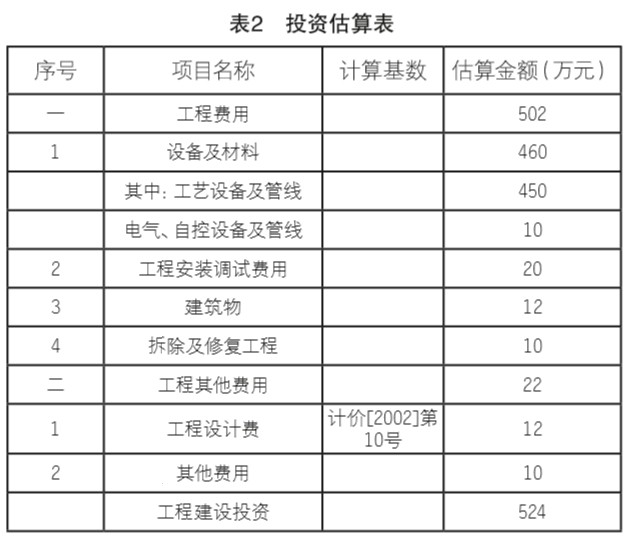 本工程投資包括曝氣系統(tǒng)技術(shù)改造范圍內(nèi)的建、構(gòu)物、工藝設(shè)備及管線安裝,電氣、自控系統(tǒng)工程及拆除修復(fù)工程,總投資估算為524萬元,見表2