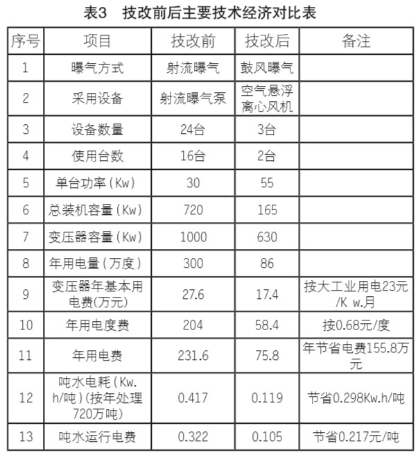 1、日處理能力2萬噸污水廠采用射流曝氣系統(tǒng)單項(xiàng)年實(shí)際用電量300萬度,技改采用空氣懸浮離心風(fēng)機(jī)曝氣后,單項(xiàng)年實(shí)際用備注電量為75.8萬度,曝氣單項(xiàng)噸水電耗由0.417Kw.h/噸降為0.119Kw.h/噸。