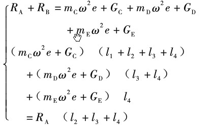 在制造與安裝風機葉片與軸時, 質心與軸線 間存在一定的偏移量, 通常要求動平衡試驗精度 達到 6. 3級, 最大偏心距允許 010406 mm。按偏 心距和額定轉速計算不平衡載荷( 離心力, 式( 1) 中的 mX2e 項) 。根據作用在平衡物體上力的總 和為零, 力矩總和為零, 建立方程組: