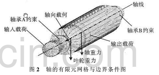 圖 2 軸的有限元網格與邊界條件圖 風機軸的材料為 45 號鋼, 其彈性常數為 2. 1 @1011 N/ m2, 泊松比 0. 3, 密度 7 800 kg/ m3。 2. 2. 1 靜力學分析 如圖 2 所示, 對風機軸模型施加約束與作用 力, 進行靜力學分析。根據電機功率與轉速, 計算 出輸入轉矩為 5 160 N#m。將輸入轉矩轉化為作 用在聯軸器處的切向載荷, 施加在軸外表面 24@ 8個節(jié)點上, 每個節(jié)點上作用力的為 448. 00 N。 輸出轉矩轉化為作用在葉輪處的切向載荷, 施加 在軸外表面 24@ 1 個節(jié)點上, 每個節(jié)點的切向力 為1 869. 93 N。同時將軸向力、聯軸器、軸與葉輪 的重力分別施加在各幾何中心的節(jié)點上。 模型的靜力學分析, 得到通過軸心剖面上的