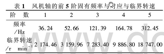 2. 2. 2 動力學分析( 模態(tài)分析) 工作時, 風機軸不僅承受軸、葉輪等的自重, 還承受輸入轉矩、軸向沖擊等動態(tài)載荷。當轉速 達到軸的固有臨界轉速時, 軸的撓度達到最大值, 處于/ 臨界0狀態(tài), 將產生劇烈的振動, 導致軸壽命 下降, 因此, 對風機軸進行模態(tài)分析是有必要的。 建立風機模態(tài)分析模型時, 在軸承的兩端施加徑 向約束, 并在軸承 A 處施加軸向約束, 同時將葉 輪看作集中質量作用在其幾何中心處。風機軸的 模態(tài)分析求得前 5階固有頻率, 如表 1 所列。