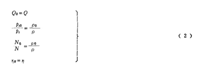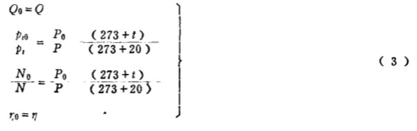 式 ( 2 ) 中的口。 、 幾。 、 N 。 、 10 為標(biāo)準(zhǔn)狀況下即性能曲線 ( 或性能表 ) 中的各性能參數(shù) , 而Q 、 P, 、 N 、 芍為風(fēng)機(jī)實(shí)際工作條件下 的各性能參數(shù) 。 式 ( 2 ) 為輸送 的氣體密度 改 變 時(shí)風(fēng)機(jī)性能參數(shù)換算式 。![]()
