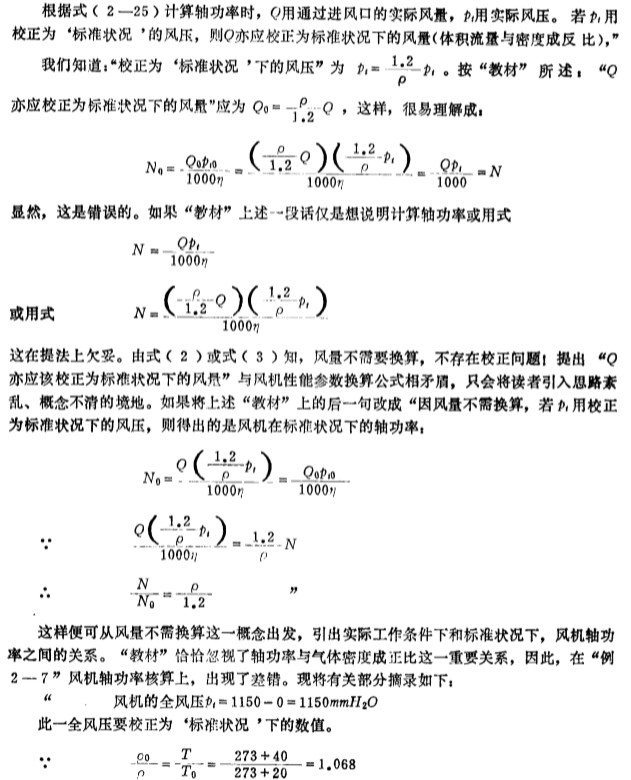 應(yīng)當(dāng)指出: 式 ( 3 ) 僅適用于 愉送空氣的場(chǎng)合 。 由式 ( 2 ) 或式 ( 3 ) 可 以看出: 若輸送時(shí)的氣體狀況 與標(biāo)準(zhǔn)狀況 不同, 在選擇風(fēng)機(jī)時(shí) 需妥換算的是風(fēng)壓 , 而風(fēng)量不需換算, 為風(fēng)機(jī)實(shí)際工作條件下單位時(shí)間內(nèi)通過風(fēng)機(jī)進(jìn) 口的氣體 體積流量 。 這是可 以理解的, 因?yàn)橛渌?的氣體狀況不同, 只會(huì)影響送氣的質(zhì)量流量, 其體積 流量財(cái)是相同的。 體積流量主要與風(fēng)機(jī)的葉輪形狀、 尺 寸和轉(zhuǎn)速有關(guān)。 如果被愉送的氣體密 度大于標(biāo)準(zhǔn)狀況下的空氣密度。。 = 1 . 2枯加“ , 還需要按式 ( 2 ) 或式 ( 3 ) 核算袖功 率 , 以防其值超過性能表中與風(fēng)機(jī)配套的馬達(dá) 功率 。 新編 《 化工原理 》教材上冊(cè) ( 以下簡(jiǎn)稱 “ 教材” ) 在風(fēng)機(jī)性能參數(shù)換算的論 述 及 例 解 上 , 存在著概念上 的問題 , 現(xiàn)提出, 以共商榷: “教材” 第119 頁寫道 :“通風(fēng)機(jī)的軸功率表示如下:.jpg)