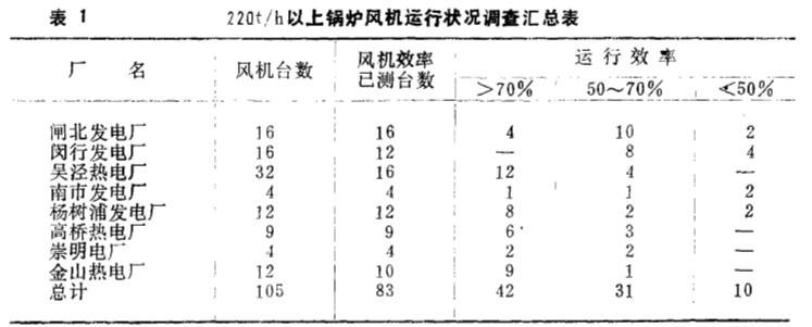 鍋爐風(fēng) 機(jī)的容量 隨著鍋爐容量 的增 長(zhǎng)而相應(yīng)增加 。 一 臺(tái)12 . 5萬(wàn)千 瓦 機(jī)組, 風(fēng) 機(jī)電動(dòng)機(jī)的 功率 為 25 00 千瓦 , 占機(jī)組容 量的 2 % 。 _ 仁海地 區(qū) 電廠(chǎng) 220 噸/ 時(shí) 以上 鍋爐 有3 。臺(tái), 裝機(jī) 容 量 為 165 萬(wàn)千瓦, 配 套風(fēng) 機(jī)共有 ]0 5 臺(tái), 電機(jī)功率 為5 . 32 萬(wàn) 千瓦 , 占裝 機(jī)容量的 3 . 2 % , 其所 消耗的總 電量約 占機(jī)組 發(fā)電量的1 . 8~ 2 . 7% 。 可見(jiàn) 風(fēng) 機(jī)是電 站 中最大的耗能設(shè)備之一 。 從 目前風(fēng) 機(jī)的運(yùn)行狀 況來(lái)看, 上 述 105 臺(tái)風(fēng) 機(jī)都是高效離心風(fēng)機(jī), 設(shè)計(jì) 效 率 在 8 1~ 85 % ( 帶進(jìn) 風(fēng)箱 ) 。 但 從調(diào)查結(jié)果說(shuō)明, 目前風(fēng)機(jī)實(shí)際 運(yùn)行效率普遍較低 ( 見(jiàn)表 1 ) 。 其造 成原因如下: ( i )風(fēng) 機(jī)造 型不 合理 , 富裕量太大, 設(shè)計(jì)工 況與系統(tǒng) 不匹 配 ; ( 2 ) 在變負(fù) 荷工 況下 , 調(diào) 節(jié) 損失 過(guò)大 。
