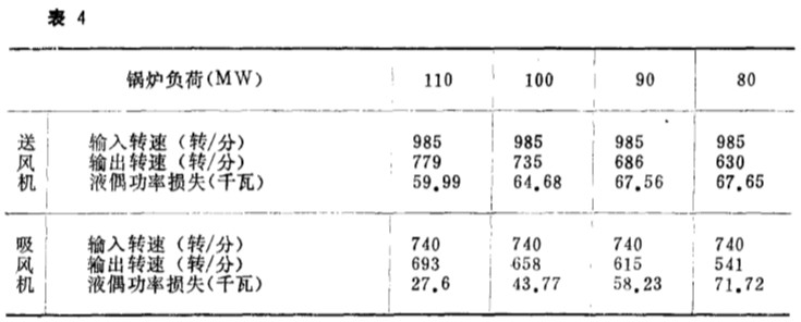 閡行 發(fā)電廠(chǎng)聳 8爐送風(fēng) 機(jī)在設(shè)計(jì)工 況時(shí), 額定功率為 458 . 75 千 瓦 , 吸 風(fēng) 機(jī) 為 49 8 . 95 千 瓦, 液力偶合器在不 同轉(zhuǎn)速比 i 下的功率損失見(jiàn)表 4 。 由表 4 可知, 送 風(fēng)機(jī)液力偶合器的 最 大功率損失不超過(guò) 70 千瓦, 吸風(fēng) 機(jī) 液偶的最大功率損失不超過(guò) 75 千瓦。 與送 、 吸風(fēng)機(jī) 使用 液力偶合器調(diào) 速調(diào)節(jié)所能節(jié)約的功率相比相對(duì)較小。