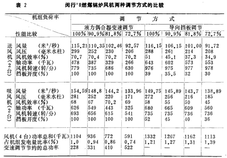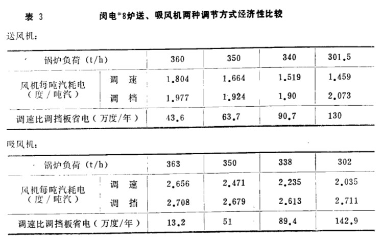 3 . 經(jīng)濟(jì)性比較 表 3 是 閡行發(fā) 電廠(chǎng) “8爐送 、 吸風(fēng)機(jī)在鍋爐不同負(fù)荷下兩種調(diào) 節(jié)方式 的經(jīng) 濟(jì)性 比較 。 從表 3 中可 以看出, 如年運(yùn)行 以 700 。小時(shí)計(jì)算 ; 在機(jī)組負(fù) 荷 為 110 M W 時(shí) 風(fēng) 機(jī)節(jié) 電為56 . 5萬(wàn)度/ 年; 10 0人生W 時(shí), 節(jié)電為 11 4 , 7 萬(wàn)度/ 年; 90MW 時(shí), 節(jié)電為 180 . 1 萬(wàn) 度 / 年 ; soMW 時(shí) , 節(jié)電為 2 72 . 9 萬(wàn)度/ 年。 因此, 當(dāng)鍋爐經(jīng)常變負(fù)荷或常處于低負(fù)荷時(shí) , 節(jié) 電效果 還是 相當(dāng)可 觀(guān) 的。
