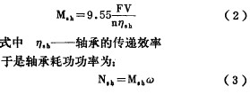 對(duì)于離心葉輪, 為節(jié)省超速功耗 , 通常用 檔板封隔進(jìn) 口, 這時(shí)運(yùn)轉(zhuǎn)耗功由下列四部分組 成:1 . 齒輪增速器耗功 由于齒輪嚙合和 軸承副摩擦所耗的 功, 可 用總耗功的傳遞效率 刀來(lái)表示〔” 。 2 . 軸承箱軸承 副雇擦耗功 由于 軸承和 軸之 間的摩擦損失 引 起 的 耗 功 , 它 與潤(rùn)滑油性質(zhì)及溫度有關(guān), 據(jù) 文獻(xiàn)[ 2 〕 介紹 , 軸承副摩擦力 F 決定于轉(zhuǎn)子重量 G 與摩 擦系數(shù) f 。 而 f 與油溫、 油質(zhì)及工件的材質(zhì) 、 工藝有關(guān), 可在手冊(cè)中選取 。 F 二 fG ( 1 ) 而摩擦力矩M . 、 與軸的半 徑有關(guān), 或者說(shuō)與軸 的線速度 v 和轉(zhuǎn)速 n 有關(guān)。 考慮到前后兩端軸 頸直徑不 一, 故線 速度 記 為 v : 和v Z , 按式 (2 ) 近似 計(jì) 算 M . 、 或 者 取 F/ 2 對(duì) v , 和 v : 分別計(jì)算均可。