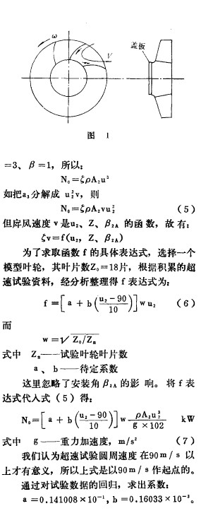 為 了確保離心風(fēng)機(jī)運(yùn)轉(zhuǎn)的可靠性 , 往往 需 要對(duì)其葉輪進(jìn)行超轉(zhuǎn)速運(yùn)轉(zhuǎn)考核, 并獲得材質(zhì) 強(qiáng)度 、 葉輪結(jié)構(gòu)特征對(duì)安全系數(shù)影響等設(shè)計(jì)參 考數(shù)據(jù)。 葉輪超速時(shí)所耗功率關(guān) 系到試驗(yàn)臺(tái)動(dòng) 力源的承受能 力。 例如具備5。。 k w 動(dòng)力的試驗(yàn) 臺(tái)能否完成配用 3 o00k w 以上功率的大中型 鼓 風(fēng)機(jī)葉輪的超速r 解答這一問(wèn)題的關(guān)鍵是如何 比較準(zhǔn)確的估算超速時(shí)的耗功 。 本文分析 了葉 輪超速時(shí)的耗功類(lèi)型及 其機(jī)理, 根據(jù)有關(guān)公式 和試驗(yàn)數(shù)據(jù)的 回歸, 推薦一個(gè)既實(shí)用又 可靠的 估算超速耗功的半經(jīng)驗(yàn)公式。