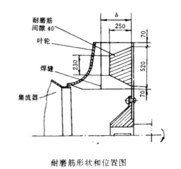 3 . 3 加焊耐磨筋 風(fēng)機(jī)葉 輪 葉 片 全 部 更 換 焊 接 完 后 , 用 中6m m 的不 銹鋼鋼筋制 作 耐 磨筋 , 耐磨筋 兩邊 用 不銹鋼焊 條 (或 T D O 一 3 型耐 磨焊條 )連續(xù) 焊接 到葉 片上 , 耐 磨筋 的形狀和 位 置 見附 圖。