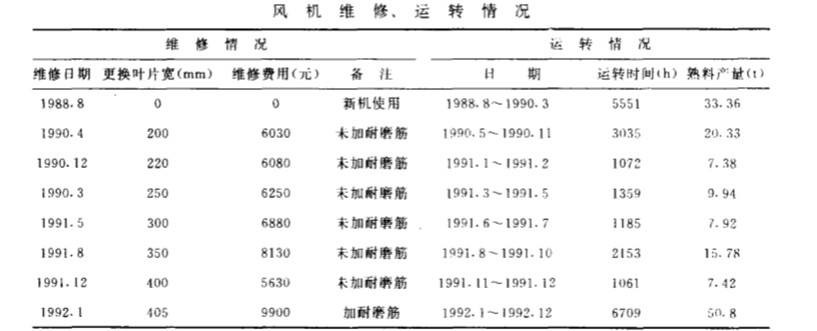 從 1988 年 8 月投 產(chǎn)至 19 92 年 12 月 , 風(fēng)機(jī) 葉輪葉 片共更換 7 次 , 特別是 1991 年葉片更換5 次 , 全 年風(fēng)機(jī) 運(yùn)轉(zhuǎn) 69 20 h , 共生產(chǎn)熟料 47 · 6 萬t , 平均 每更 換一次 葉 片風(fēng) 機(jī) 運(yùn)轉(zhuǎn) 1384 h , 生產(chǎn)熟料 9 . 52 萬 t , 全年維修費(fèi)用 3297 0 元 /a 。 從 1 9 9 2 年 1 月風(fēng)機(jī) 葉輪 葉 片加焊 耐磨 筋 至 12 月 , 風(fēng)機(jī)共運(yùn) 轉(zhuǎn) 6 7 0 9h , 生 產(chǎn)熟料 50 . 8 萬 t 。 比 1991 年多生產(chǎn)熟料 41 . 28 萬 t , 葉輪葉 片 提高 壽 命 4 . 3 倍 , 19 92 年維修費(fèi)用 9 9 0 。 元 , 比9 91 年可節(jié) 省維修費(fèi)用 2 . 54 萬 元 , 中間可減 少 4 次停機(jī)檢修時(shí) 間 , 增 產(chǎn) 熟料 5 . 31 萬 t , 葉 輪 的 使用 壽命可 延長 0 . 4 倍 , 風(fēng) 機(jī)維 修運(yùn)轉(zhuǎn)情 況 見下表 。