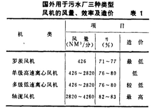 表 1 是根據(jù)美國國家環(huán) 保局提供 的70 年 代末國外用于 污水 廠的三種 類型 風 機 的鳳 量 、 效率和造價一覽表。