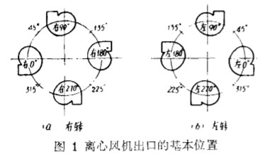 經(jīng)過(guò)換算, 在標(biāo) 準(zhǔn)狀態(tài)下 , _ L 述 三臺(tái)離心風(fēng)機(jī)的 比轉(zhuǎn)數(shù) ( n , ) 都很小, 按 國(guó)際單位制 (5 1) 基本上是在 1 . 弱一 6 . 14 ( 相當(dāng) 于 Mk fs 制 為 10~ 35 )范圍內(nèi)。 這 三臺(tái)風(fēng)機(jī)都是懸 臂式 結(jié)構(gòu) , 各 由一 臺(tái) 二極的交流電機(jī)用一對(duì) 三角皮帶 輪 增 速 傳 動(dòng) , 它相 當(dāng)于 我國(guó) 風(fēng)機(jī)行業(yè)中現(xiàn)行 習(xí)慣 稱 呼 的 “ C 式” 傳動(dòng)結(jié)構(gòu)。 渦殼的出日 方 向有 八 個(gè)基本位置( 圖 1 ) 。 其中循環(huán)風(fēng)機(jī)和廢 氣風(fēng) 機(jī)還可實(shí)現(xiàn) “ 右轉(zhuǎn)” 或 “ 左轉(zhuǎn) ” . 以上 可根 據(jù)用 戶使用要求來(lái)改變 。