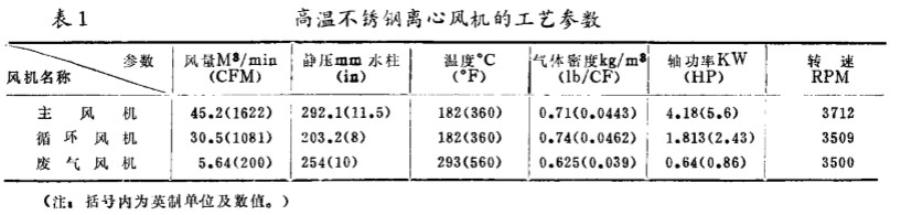 1 9 8 0 年 從 美 國(guó)Sfo r k 一 B o w e n 公司 引進(jìn)的 整套干燥 裝置中有三 臺(tái)高溫不銹 鋼離心風(fēng)機(jī) , 它們?cè)?工 藝 條件下 的性能參數(shù)綜合為 表 1 。