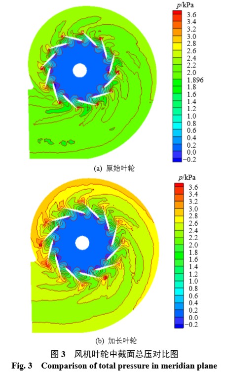 1.2 加長前后的內(nèi)流特征 原風機葉片加長后,葉輪直徑也同時增大,而 由葉片式泵與風機的能量方程式[1-2]可知,風機的做 功能力與葉輪外徑成正比,因而氣流總壓在風機內(nèi) 將顯著提高。 圖 3 和圖 4 表明,葉輪葉片加長后風機中的氣 流自葉片加長部分附近,總壓明顯升高。而且,由 于風機葉輪加大后,蝸殼尺寸并未改變,因而蝸殼 內(nèi)氣體的流通面積相應(yīng)減少,使得蝸殼內(nèi)氣體流速 加快,總壓進一步增加。圖 3 和圖 4 還表明,葉輪 葉片加長的同時,蝸殼內(nèi)流場的均勻性也有所下 降,同時蝸殼內(nèi)氣流速度加快,使得蝸殼損失相應(yīng) 增加[12-13],將導(dǎo)致風機效率有所下降。 圖 5 為葉輪葉片加長前、后蝸舌附近總壓分布 的對比圖。氣流在葉輪內(nèi)的壓力面和吸力面上,壓 力分布均為從葉片前緣至后緣逐漸增大。另外由于 氣體流動的連續(xù)性,且葉片加長前后風機出口均設(shè) 定大氣壓強作為邊界條件,這使得葉片加長后對氣 體總壓的影響并不局限于加長部分之后,對加長部 分之前也會有影響。比較圖 5 中葉輪入口處的低壓 區(qū)可知,葉片加長后,葉輪入口處低壓區(qū)域的面積有所減少。