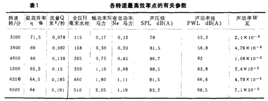 各轉(zhuǎn)速下最 高效率的數(shù)值, 以及最高 效率點的流量 、 全壓 、 軸功 率、 有 效 功 率 、 聲壓級 (A ) 、 聲功 率級(A ) 、 聲功率等有關(guān)參數(shù)如表 1所 示。