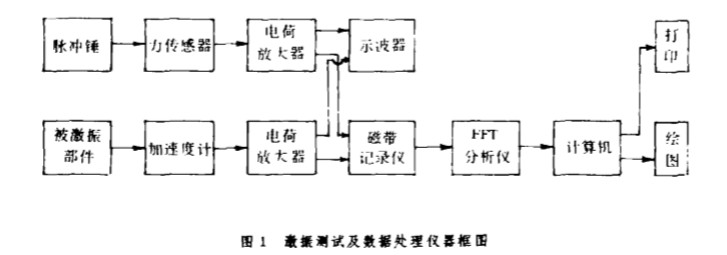 本試驗(yàn)采 用 四平鼓風(fēng)機(jī) 廠(chǎng)生產(chǎn)的 9 一28 一 1 4A 離心式通風(fēng) 機(jī) 進(jìn)行脈沖激振 , 從而進(jìn)行 譜分 析和模態(tài)分析 , 為尋找 誘發(fā)噪聲 , 識(shí)別噪聲源提供依據(jù) . 將風(fēng)機(jī)分成葉輪和機(jī)殼 兩部分分別進(jìn)行激振 , 且兩部分 均是 多點(diǎn)激振 , 一點(diǎn)拾 振. 試 驗(yàn)時(shí) , 分別記錄 了脈沖力信號(hào)和 加速度 響應(yīng)信號(hào) , 并 由 FFT 分 析儀和 計(jì)算機(jī)進(jìn) 行 信號(hào)分析 和數(shù)據(jù)處理 . 圖 l 是激振測(cè)試及數(shù)據(jù)處理儀器框圖.