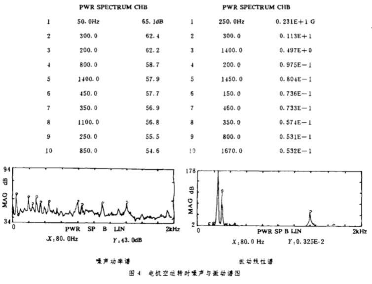 在測(cè) 量電機(jī) 噪聲信號(hào) 的 同時(shí) , 為了說(shuō)明 電機(jī) 的振動(dòng) 對(duì)風(fēng)機(jī) 噪聲的影 響 , 又 測(cè) 量了同步 振 動(dòng)信號(hào) , 振動(dòng) 響應(yīng)傳 感器 (加速度計(jì) )安裝在風(fēng) 機(jī)機(jī)架上. 圖 4 是 電機(jī)空運(yùn) 轉(zhuǎn)時(shí) 的噪聲